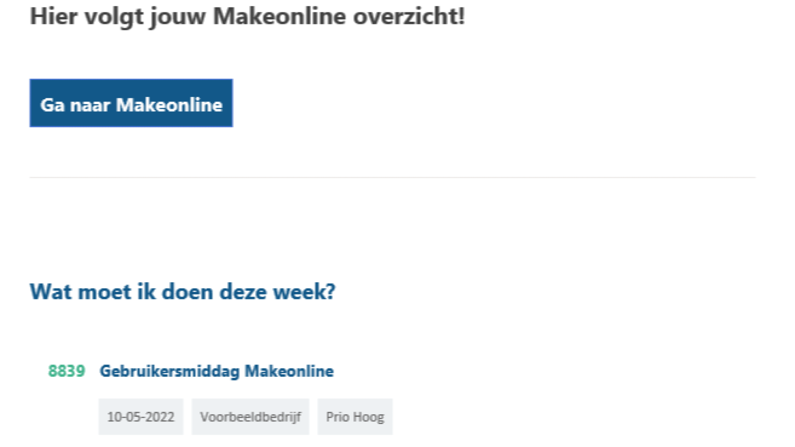 Is het je al opgevallen dat je nu vanuit Makeonline een veel overzichtelijker wekelijkse mail krijgt? Niet alle openstaande taken worden nu getoond. De focus ligt primair op de nieuwste taken die aandacht nodig hebben. En de mail verteld hoe groot het aantal taken is dat al langer openstaat. De informatie is nu sneller te scannen en te begrijpen door de gebruiker.