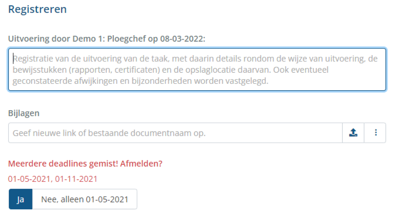 - De resultaten van eerdere registraties zijn nu in te zien via dit scherm. Ook voor (passieve) gebruikers met alleen leesrechten.