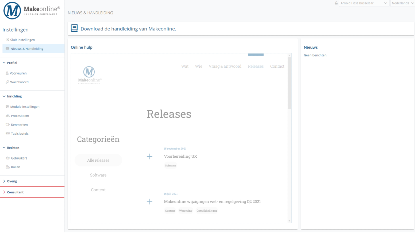 - De instellingenpagina heeft een grote make-over gekregen. Standaard wordt nu voor de administrators de release pagina getoond, zodat ze actief geleid worden naar de nieuwste veranderingen in Makeonline.